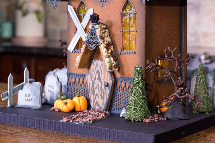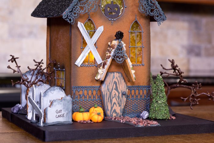 Who says gingerbread is only for Christmas?! With the inclusion of all measurements, recipes, and patterns, Susan shows you how to build her favourite kind of gingerbread house. Learn how to roll out, cut, and bake the pieces using the patterns included. Then Susan takes you through all the required parts; edible lace, piping, free hand tombstones, building, life-like roof, candy windows, broken and cracked windows, using stamp cutters, creepy chocolate trees, evergreen trees, pumpkins, gravel walk way, stone-like siding, and adding real lights, OH SO MUCH!!! Try making it this holiday season, or use different colours for a Christmas gingerbread house!