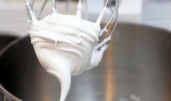 - Pour egg mixture in to the mixing bowl, fitted with the whip attachment and whip until the eggs and sugar (meringue) form a stiff peak, and the mixing bowl is cool to the touch.